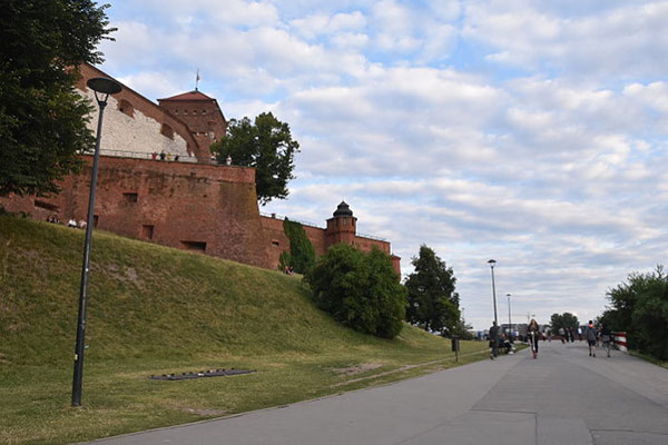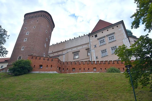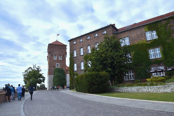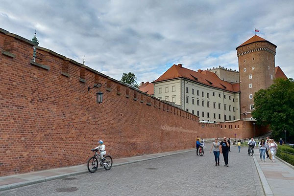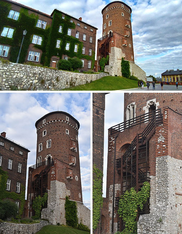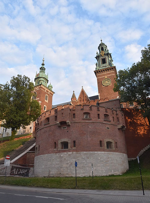 來到瓦維爾城堡東側附近:有三角形屋頂、二根突出像煙囪的是丹麥塔(Danish Tower),為中世紀的哥德式防禦塔右後方最高的是約 1603 年竣工的西吉斯蒙德三世瓦薩塔(Zygmunt III Waza Tower);右前方斜向突出的是庫爾扎斯托帕塔(Kurza Stopa Tower),建於14世紀中葉的下部支撐了瓦維爾城堡的東翼;最左方為喬丹卡塔(Jordanka Tower),位在城堡的東南角,初建於14世紀,最初具有防禦性質。
