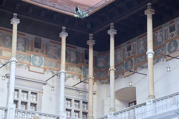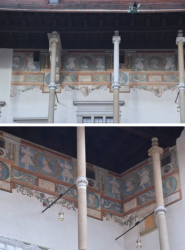 從城堡翼側環繞庭院的迴廊由帶拱廊的柱子支撐,除了二樓,柱子大一倍,末端是支撐屋頂桁架的罐子,和用吊帶捆綁。