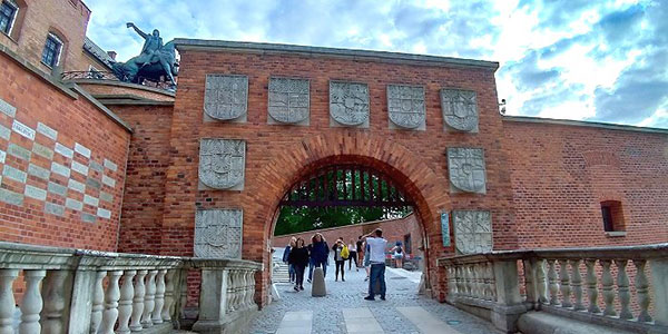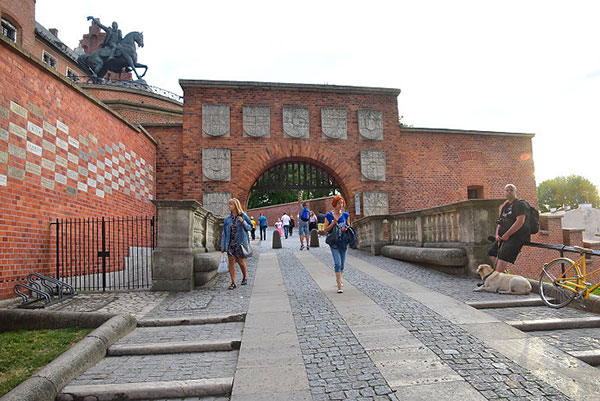紋章門,建於1905年,門上裝飾著波蘭、立陶宛、魯塞尼亞和封地的九種徽章。瓦維爾山的整修費用由公眾捐款資助,左方磚牆上交錯排列的灰色磚塊刻有捐贈者的名字。
