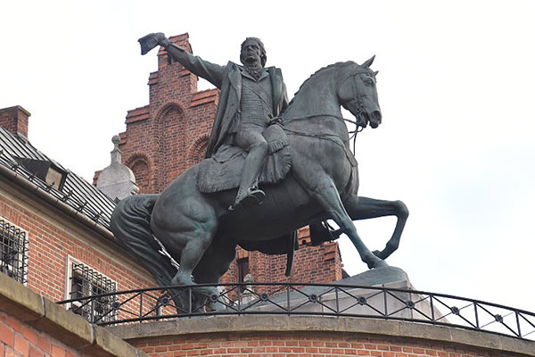 塔德烏什·科希丘什科 (Tadeusz Kościuszko ,1746~1817年) 為波蘭民族英雄,當波蘭被俄羅斯、匈牙利和普魯士瓜分的時候他于1794年領導了克拉科夫的廣場起義。現在他就安葬在雕像背後的瓦維爾主教座堂的地下。柯斯丘什科也是參加過美國獨立戰爭的英雄,是大陸軍的上校,就在華盛頓的白宮對面也矗立著柯斯丘什科的銅像。
