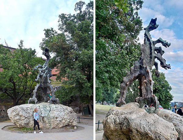 瓦維爾噴火龍(Wawel Dragon)。傳說中,此地曾被一條惡龍佔據,這條惡龍曾經住在瓦維爾城堡下方的洞穴,居民對這條噴火龍束手無策,只好定期貢獻羊來保持寧靜,此時有一位叫做克拉科夫(Krakow)的年輕人,想出一個妙計來對付惡龍,他將鹽巴塞滿了羊的體內獻給惡龍,惡龍吃下後因為找不到水止渴,就這樣活活地被鹹死,從此村莊恢復了往日的和平,而村民為了紀念這個勇敢聰明的年輕人,所以將此地以鞋匠的名字命名為「Krakow」。